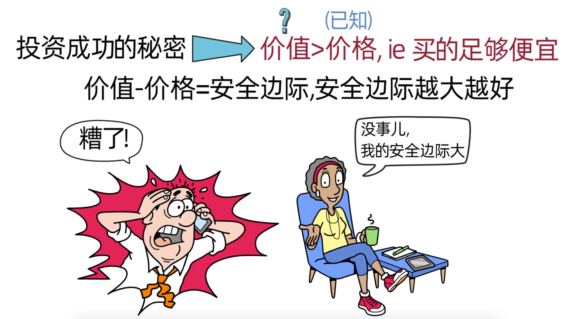 在价值投资中,投资成功的关键是,知道资产的价值,并以便宜的价格获得它(价格<价值,买入)。资产的价格和它的价值之间的差值叫安全边际,当安全边际越大,我们的潜在风险越低,回报越高。如果发生黑天鹅事件,只要我们的安全边际大,也会让我们避免大的损失。总的来说就是,我们要以便宜的价格获得高价值的资产,价格越便宜,且资产价值越高,我们的安全边际就越大,对我们就越有利。