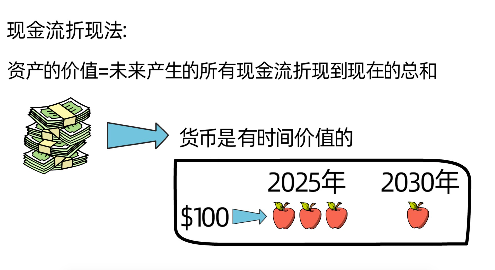 比如,现金流折现法。由于货币是有时间价值的,也就是今天的100元比5年后的100元更值钱,能买到的东西更多。资产的价值就是今后20年或30年每年获得的利润折线到现在价值多少。所以,在计算一个企业的价值时,我们可以运用现金流折现法(DCF)来计算。