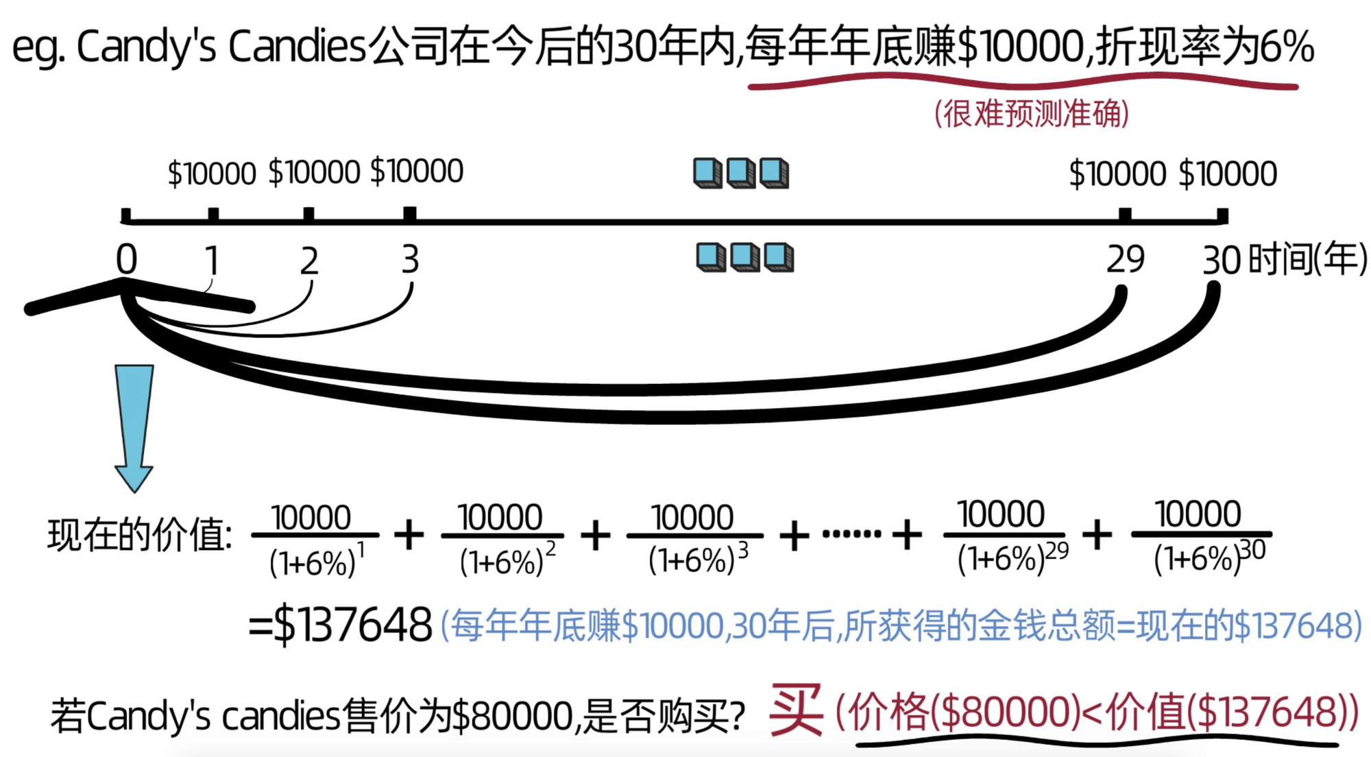 也就是说,如果candy’s candies每年能获得10000美金的利润,持续30年,且折现率为6%,那么candy’s candies现在就价值137648美金,如果有人想将candy’s candies以80000美金的价格卖个我们,要买么?