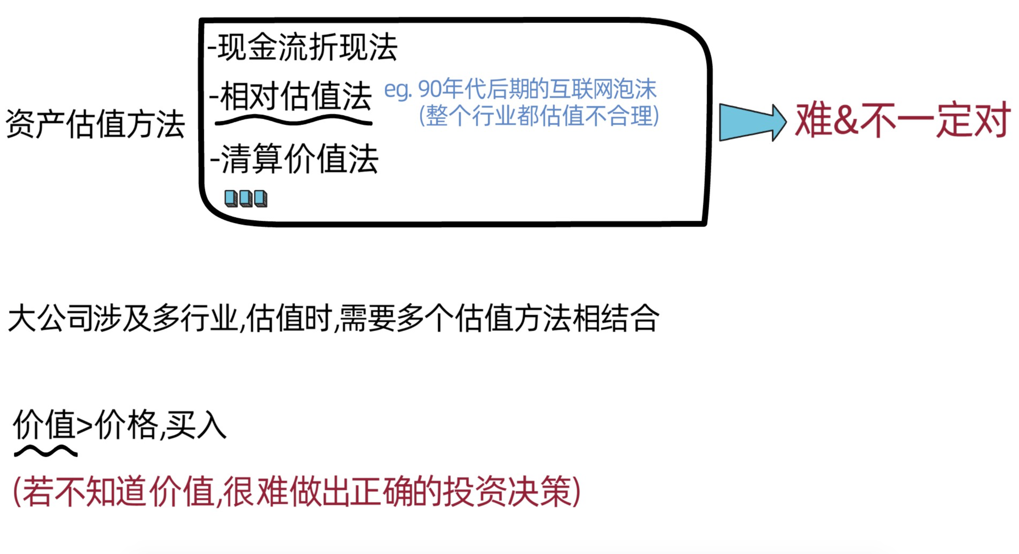当然,对资产估值的方法不只这一个,还有相对估值法,清算价值法等,但它们依然难且不一定对。