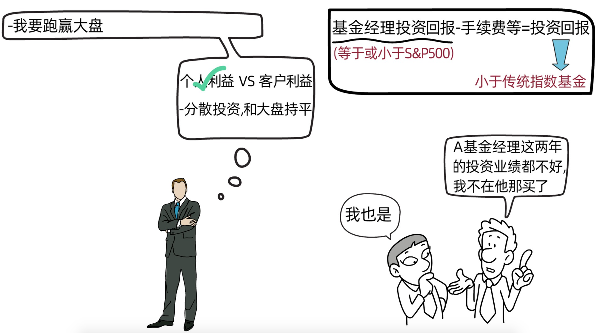 (2)当然,也有一些人将钱拿给专业的投资人士,请他们帮忙炒股,但由于企业价值估算较难,有太多变量,大部分专业人士的投资回报都低于指数基金;而且由于专业人士的收入与投资业绩挂钩,大部分专业人士很难将顾客的利益放在第一位;除此之外,专业人士还要收取管理费和其他隐形费用,仔细算下来,投资人基本没怎么赚钱。