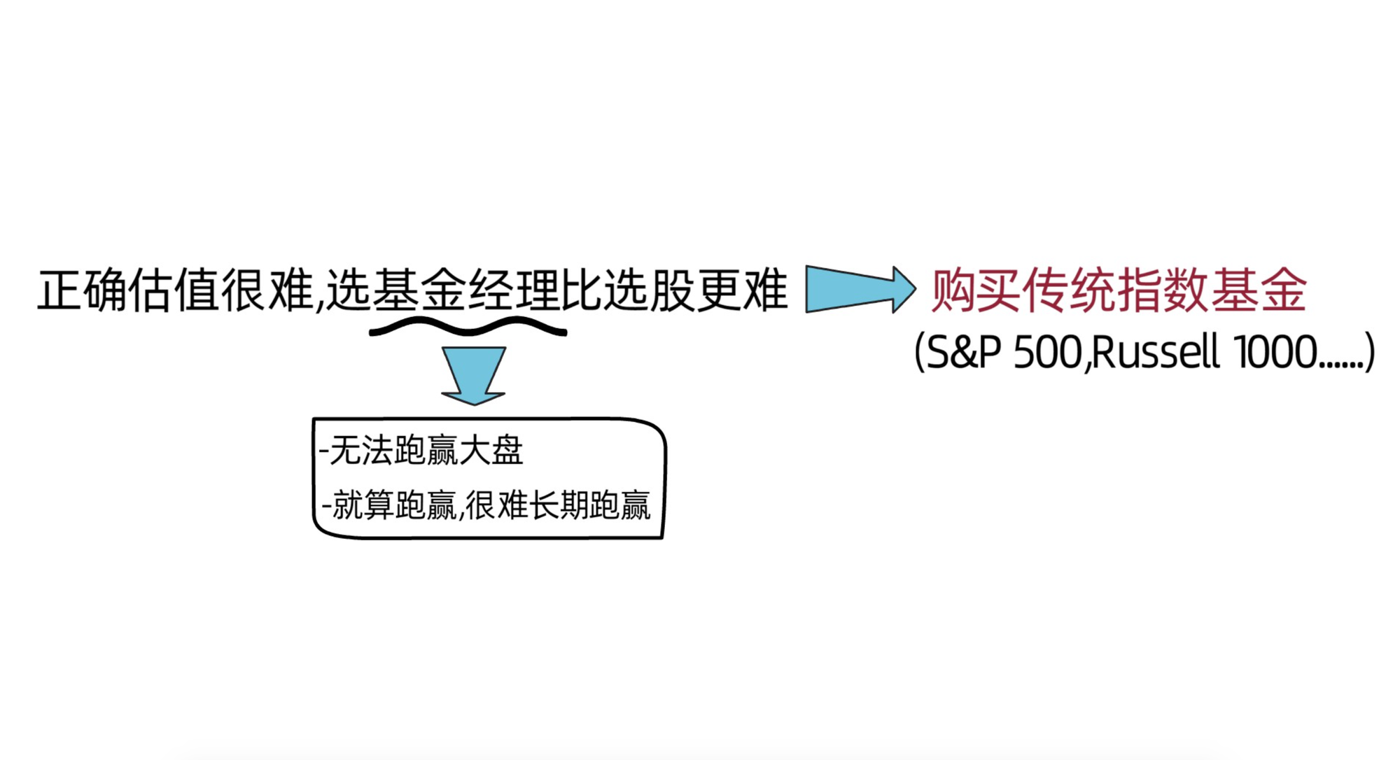 总的来说,正确估值很难,选择好的基金经理比选择股票更难。一般情况下,主动管理的基金经理都不能跑赢大盘,表现基本都比大盘差,且就算我们发现了一些能跑赢大盘的基金经理,也不能确定他们是否能持续这么好的投资业绩。所以,作者建议,如果我们无法正确估值,也不知道哪位基金经理好,最好的选择就是购买传统指数基金,比如标普500指数基金或者罗素1000指数基金。