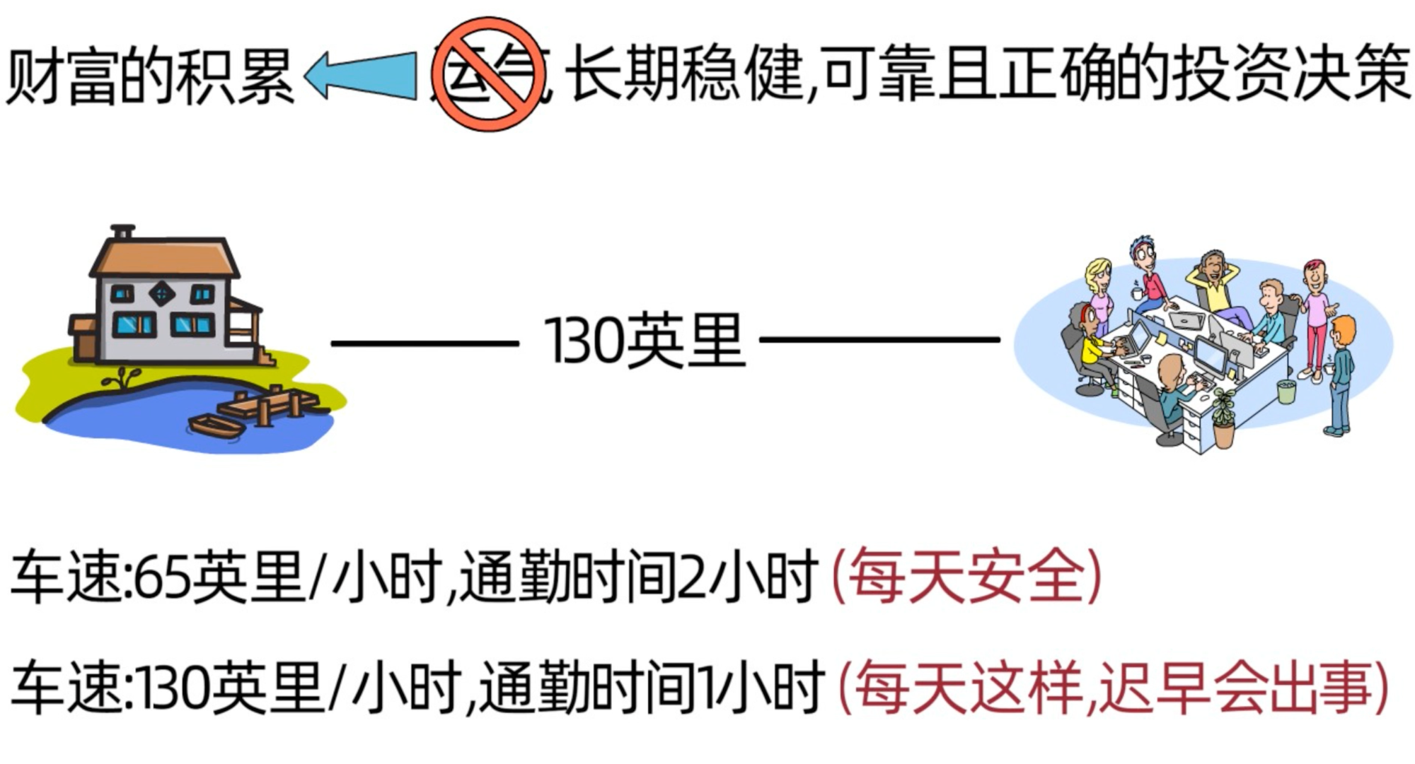 在本杰明格雷厄姆看来,财富的积累,不是靠运气,而是靠长期、稳健、可靠且正确的决策。就像开车一样,如果我们公司和家相距130英里,我们开车的时速是65英里/小时,虽然速度较慢,通勤时间要2小时,但我们每天都能安全到达;如果我们开车的时速是130英里/小时,虽然更快,开1个小时就到了,但如果每天上下班都是130英里/小时,我们迟早会出事。