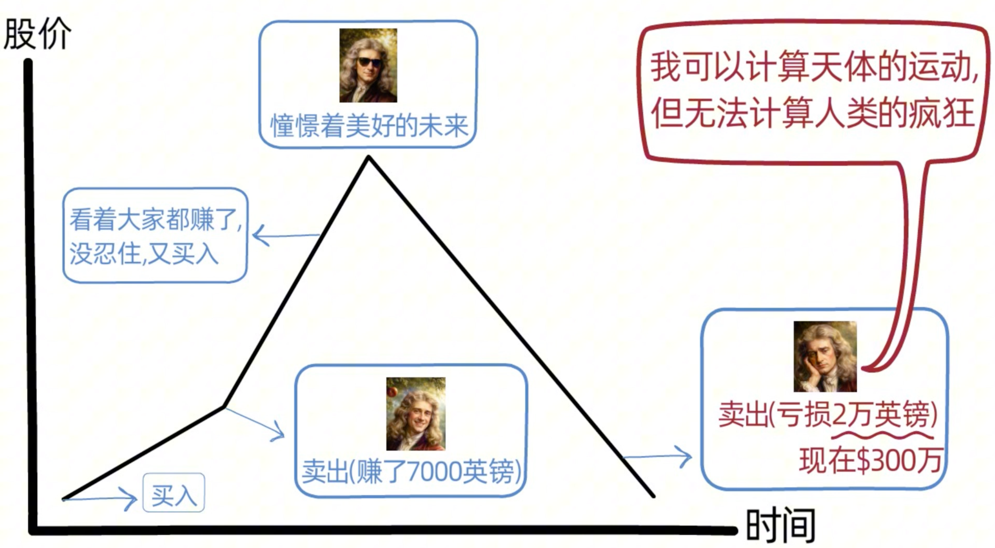 比如,科学家牛顿,他在1720年,以低价买入英国南海公司股票,后在市场上涨时,高价卖出,赚了7000英镑;卖出后,他看到英国南海公司股票依然在涨,于是几个月后,他忍不住又冲进市场,以高价购入南海公司股票,结果,亏掉了2万英镑(当时的这笔钱,相当于现在的300万美金)。后来,牛顿感叹,“我可以计算天体的运动,但无法计算人类的疯狂”。