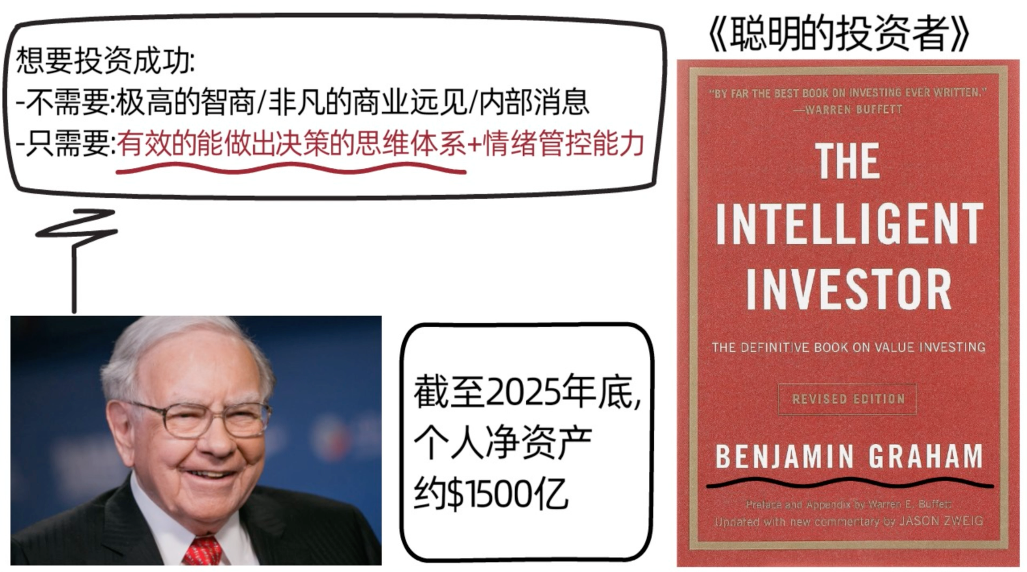 最近阅读了对股神沃伦巴菲特影响极深的书——《the intelligent investor》(《聪明的投资者》)。作者是巴菲特的老师,本杰明格雷厄姆。巴菲特通过实践书里的理念,并在实际操作中不断优化完善,最终形成了自己的投资体系,截至2025年底,他的个人净资产已达到了约1500亿美金。