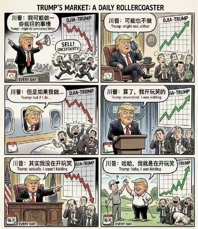 按道理来说,股票价格应该反映公司真实价值,但在现实中,股价每天都在波动。正如之前分享的投资大师霍华德马克斯在《投资中最重要的事》这本书中曾提到的,由于股市中有人类参与,人类受情绪所影响,会做出非理性行为,导致股票价格遭受上下波动(我最近在知乎看到这个截图,关于美国股市因特朗普的发言而不停的上下波动,我觉得蛮有趣搞笑的,也算是对刚刚提及的内容的解释。)