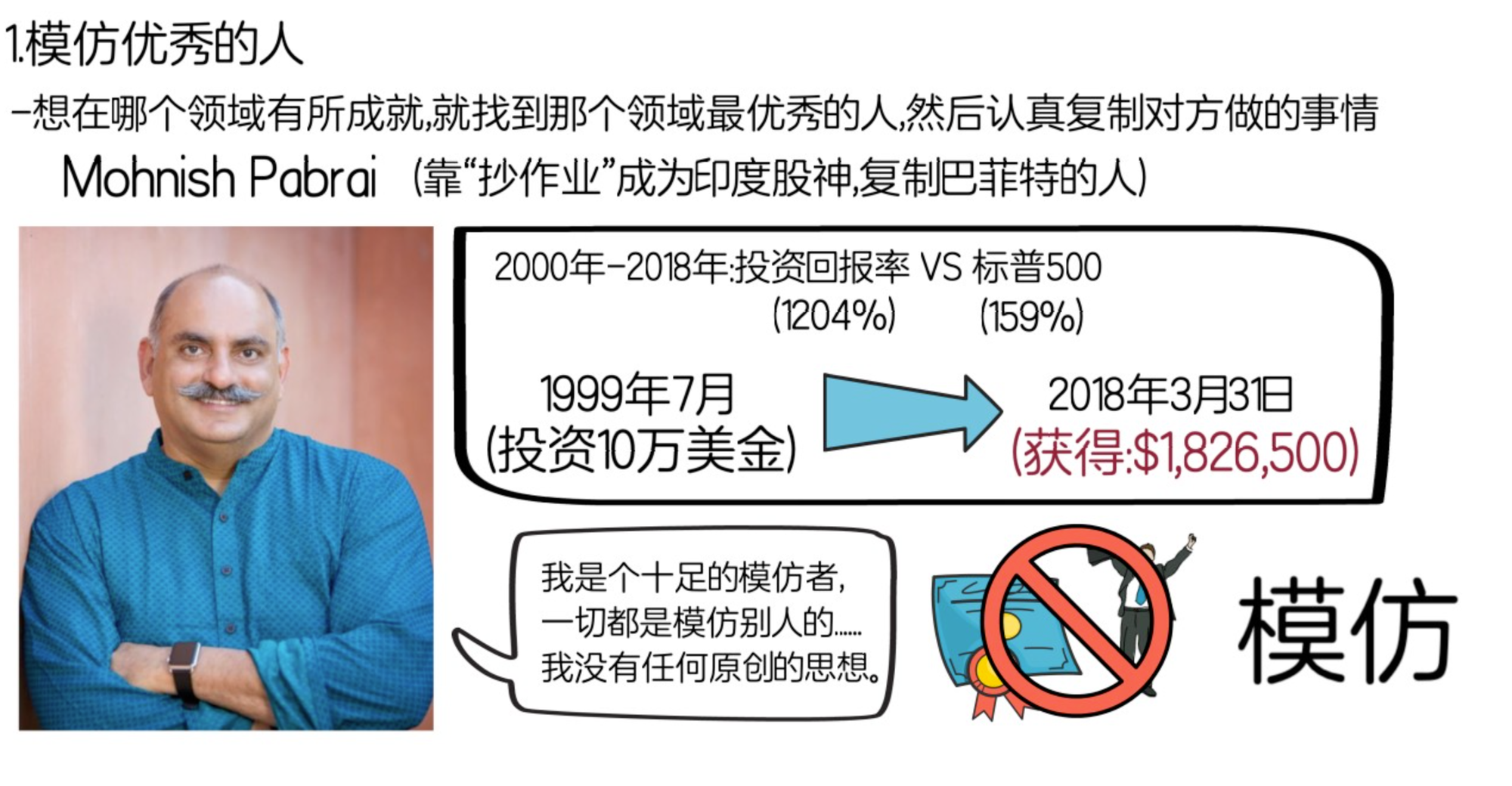 比如,莫尼斯帕伯莱(mohnish pabrai),一位完全复制巴菲特而成为印度股神的投资者。他的成功完全是因为他借鉴了别人明智的想法,他曾说过:“我是个十足的模仿者,一切都是模仿别人的……我没有任何原创的思想。”