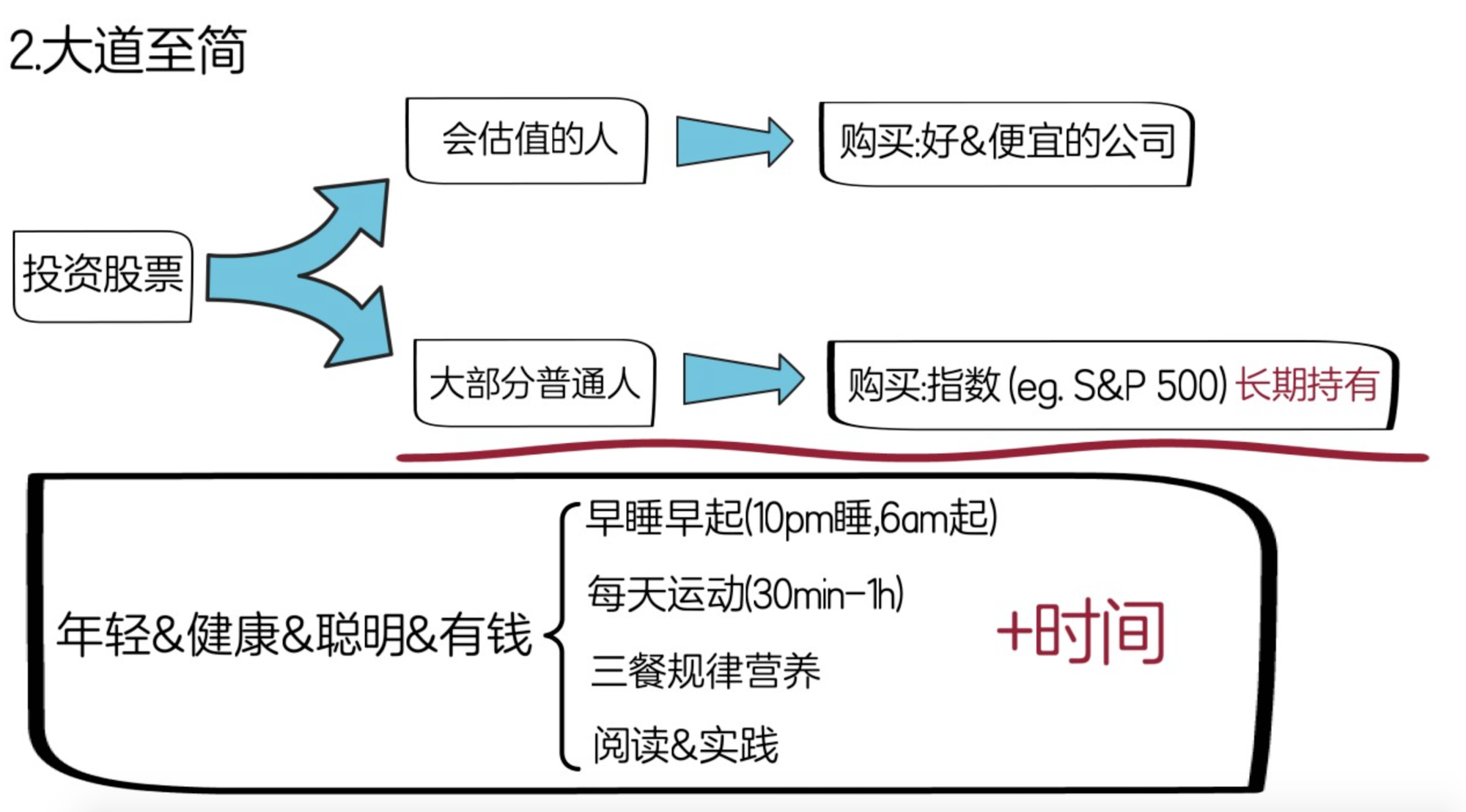 (2)如果我们不知道如何估值,又没有心思或者没有时间学,那我们最好的投资策略是购买价格便宜的指数基金,并长期持有。其实,这个概念,之前分享的《the simple path to wealth》(《通往财富的简单之路》)这本书里面也提到过。