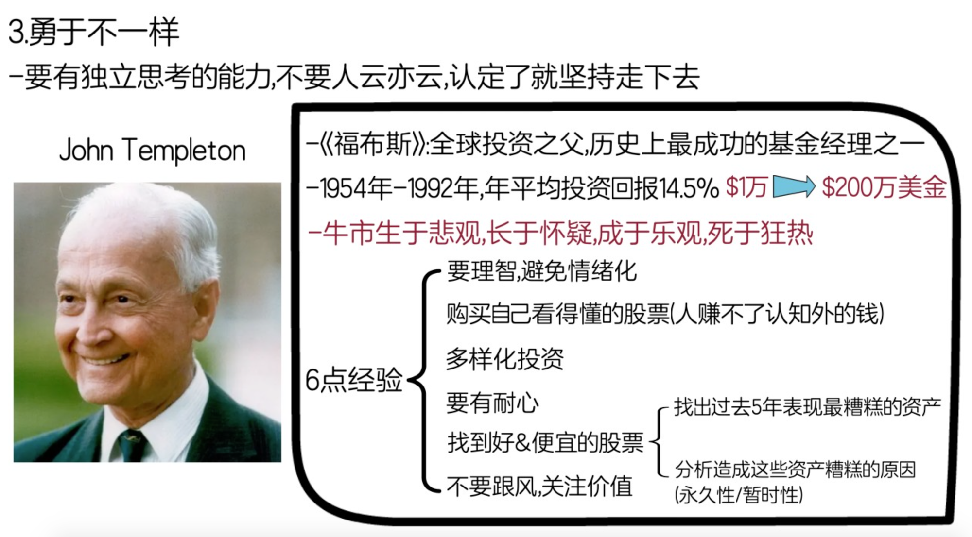 作者在书中分享了约翰邓普顿的6点投资经验: