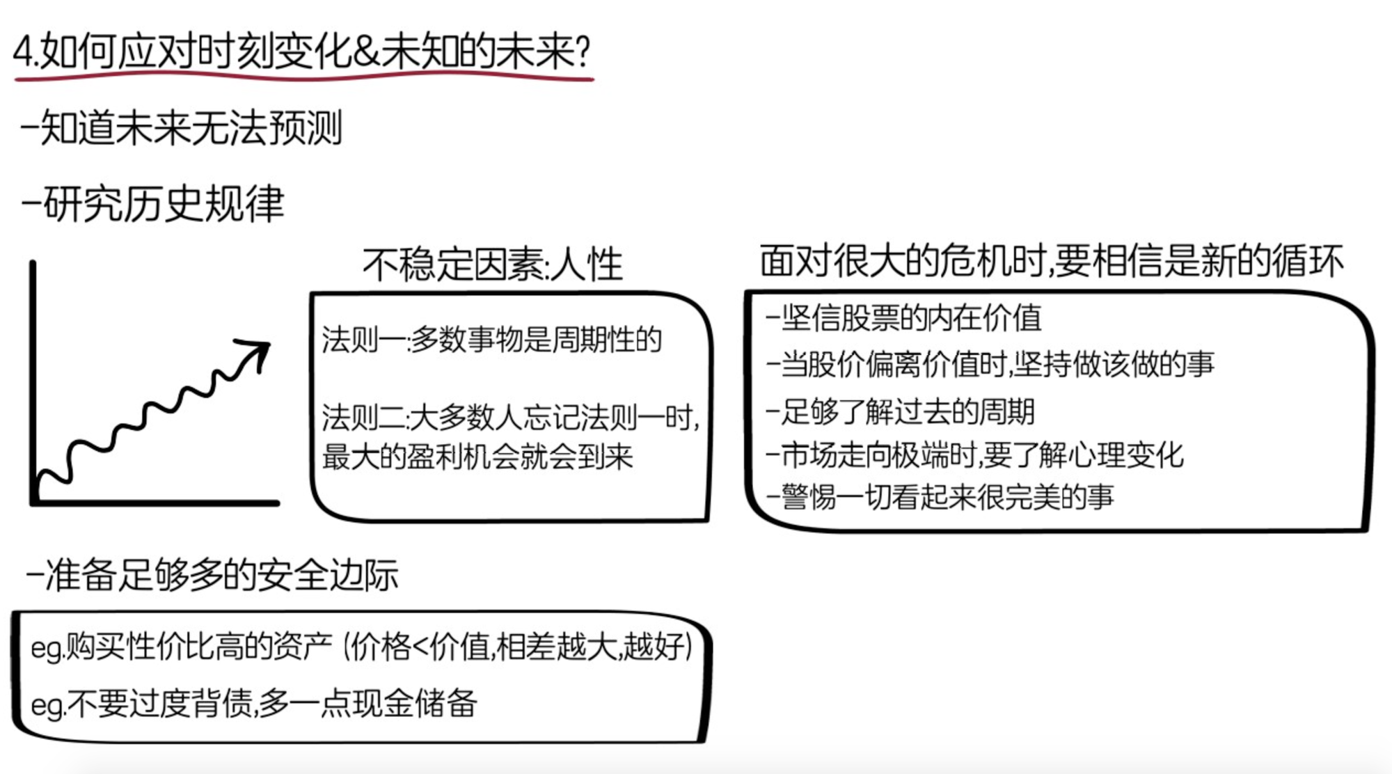 三是做足准备,给自己足够多的安全边际。比如,我们可以购买性价比高的资产。刚刚提到的,霍华德马克斯曾说的,卓越的投资是买的资产性价比要高,当我们资产的真实价值和我们购买时的价格,相差越大我们的安全边际就越大,将来获利也会更多,而且又因为价格低,所以我们的潜在风险十分有限;比如,我们不要背负过多债务,远离那些讨论火热但没有安全边际的资产,为自己准备多一点的现金储备,让自己拥有抵御风险的能力,不会被迫在经济低迷时抛售资产,也能让自己在风险期间买入好且便宜的资产,比如,2020年的新冠疫情期间,巴菲特和查理芒格的伯克希尔哈撒韦公司现金储备达1370亿美金,并借机收购了好几十家高质量企业。