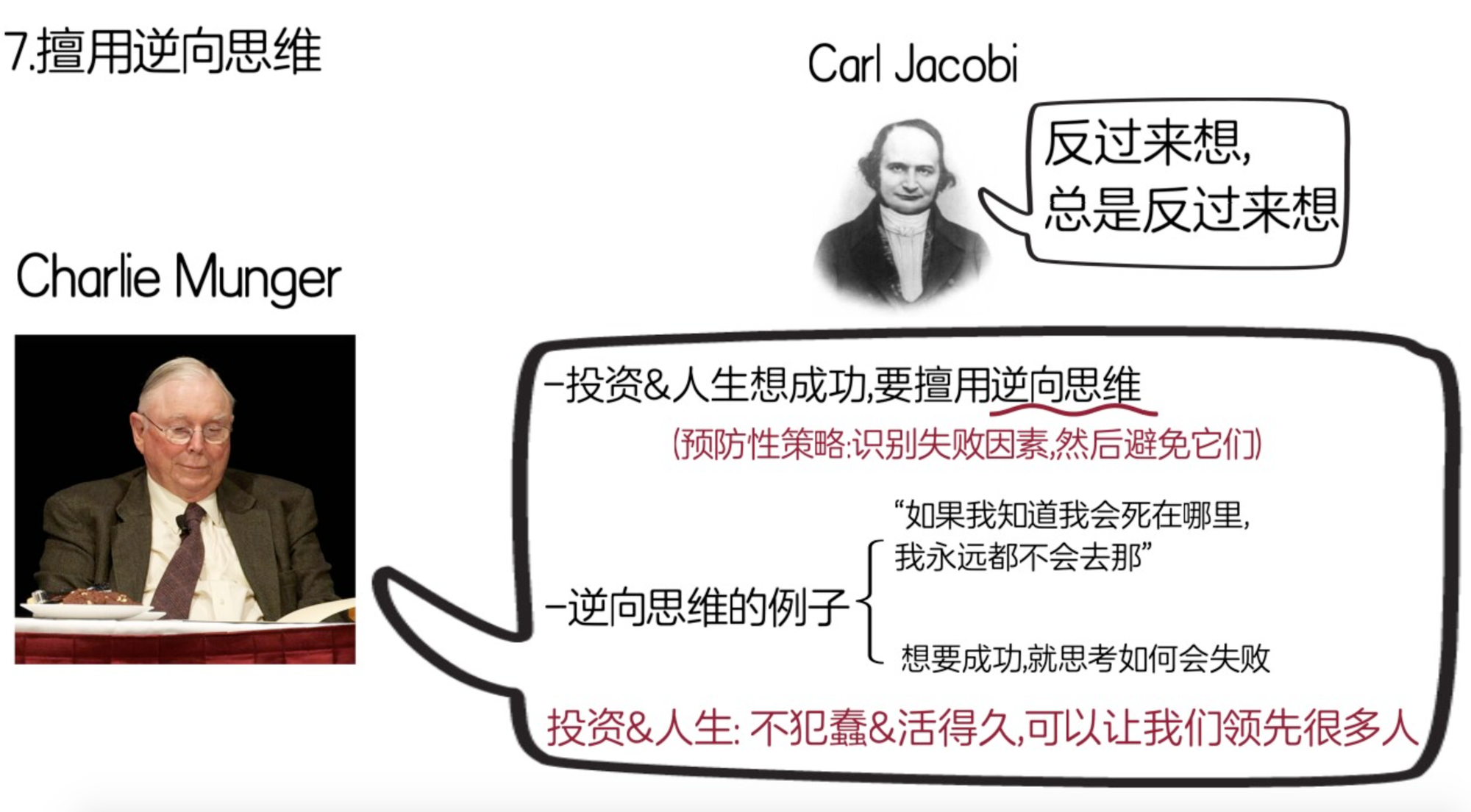 巴菲特的好伙伴,查理芒格建议,想要在投资和人生中获得成功,就要擅用逆向思维。德国数学家雅克比(carl Gustav Jacobi )有句名言:“反过来想,总是反过来想”。他们都在提醒我们,从相反的角度思考问题,可以帮助我们更加全面的看待和解决问题。就像医生诊断疾病,不仅考虑如何治疗,还要思考疾病是如何造成的。通过逆向思考,我们能够清晰地识别那些可能导致失败的因素,识别清楚后并避免它们,就可以让我们更加靠近我们想要的。逆向思维是一种预防性的策略,它帮助我们未雨绸缪,防患于未然。