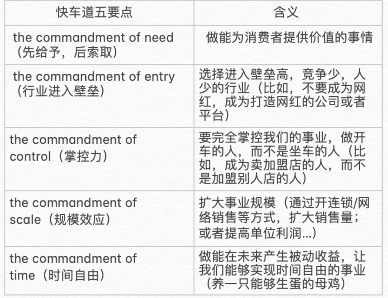 作者提到,如果我们的事业,需要我们每天花费时间去经营,并持续几十年,那这就只是个工作,并不是在快车道上的人会选择的事业。我们要创建的事业是前期我们竭尽全力,花费时间搭建事业框架,当框架搭好,事业能够自行运转,并运转良好后,就不再需要耗费我们的精力和时间,事业本身自动为我们持续带来收益。通俗一点,就是我们要养一只能为我们生蛋的母鸡。