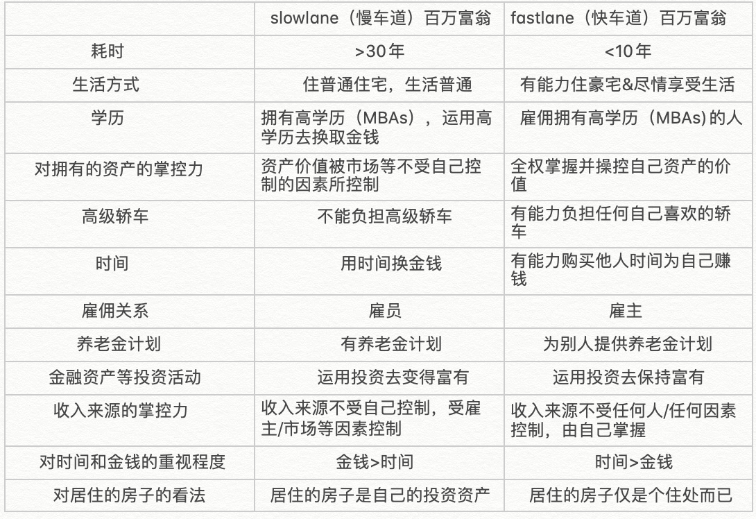 作者提出,成为慢车道上的百万富翁具有太多不可控因素和风险,快车道上的风险和慢车道风险一样大,却有着更大更值得的回报,比如我们可以在30多岁,年轻力壮的时候就可以享受财务自由,不工作都有钱赚,随时都可以去尽情探索世界和享受人生。