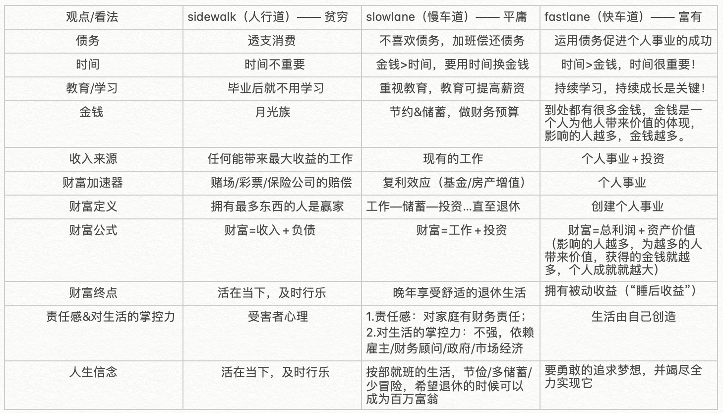 书中,作者提到,在追求财富自由这段旅途中,有三条道供我们选择,分别为人行道/慢车道和快车道。人行道对应的终点是贫穷;慢车道对应的终点是平庸,慢车道指的是社会上的大部分人,做着朝九晚五的工作,用时间换金钱,然后存钱,买基金等金融产品进行长期投资,期待复利效应可以让自己在60多岁财务自由,开始退休生活,但这时大概率体力/精力/时间等都不再像年轻时那么充足;快车道对应的终点是富有,指的是在5-10年内获得财富自由,有能力在精力充沛的青壮年时期去探索世界享受人生。