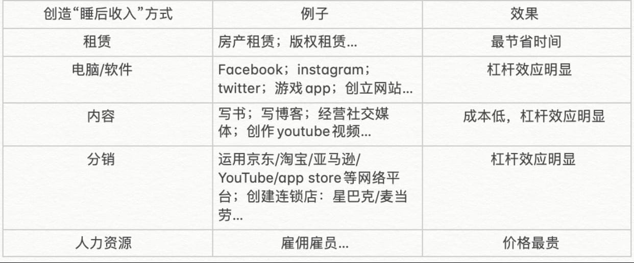 创造我们自己的“睡后收入”,指的是,创造一种随时随地都在帮我们赚钱的收入方式,这里的随时随地,指的是即便我们在休息/不工作的时候,依然有金钱流入,作者提出了5种创造“睡后收入”的方法: